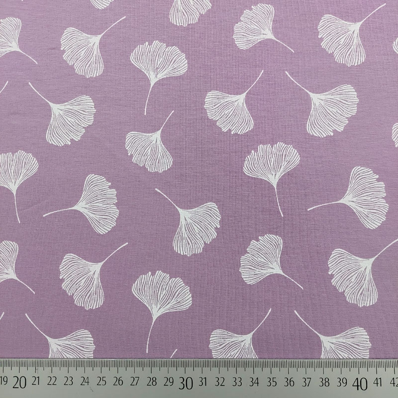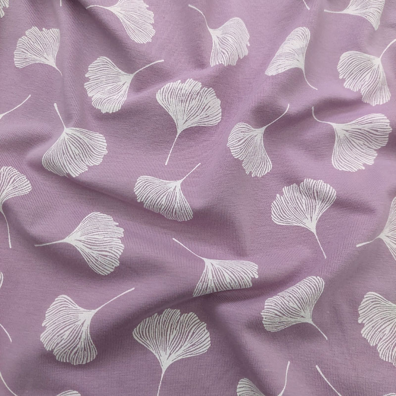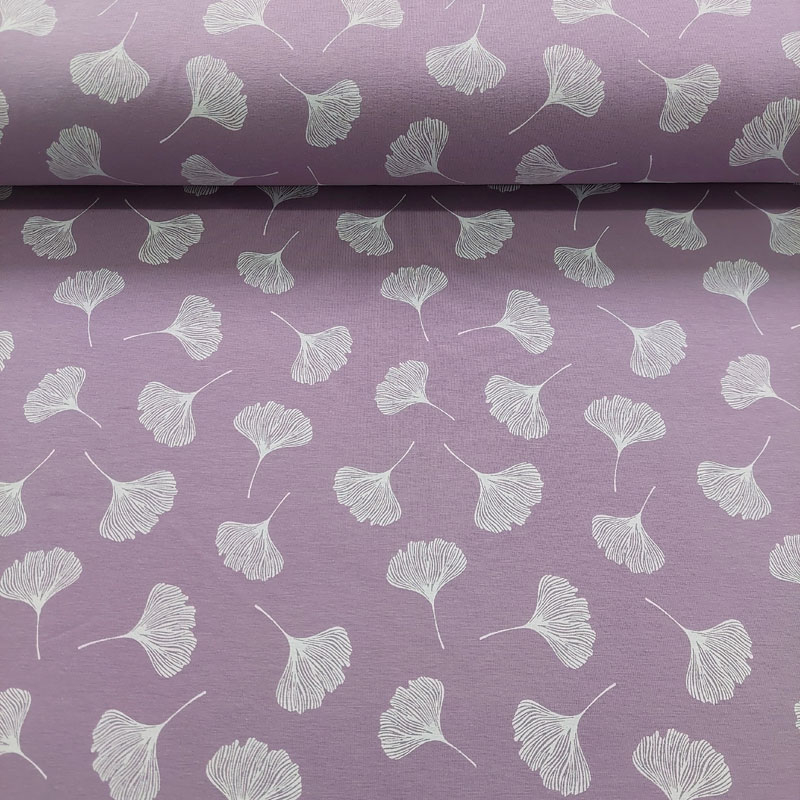 Jerseystoff Ginkgoblätter Metware, weiß flieder