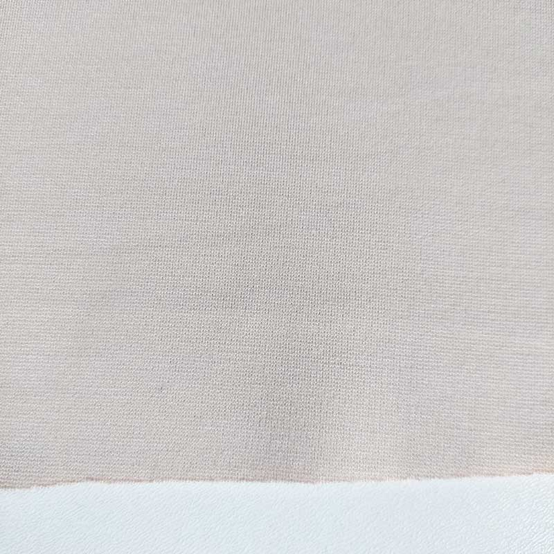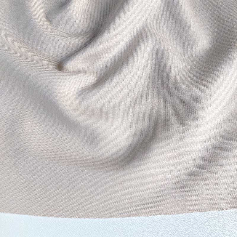 Ein schwerer und hochwertiger,helltaupe Punto di Roma Jerseystoff mit zwei rechten Seiten (2-lagig). Der Stretchjersey fällt weich und durch seine Schwere ist er super geeignet figurnahe Kleidung, denn er schmiegt sich an, aber kaschiert das ein oder andere Pölsterchen, so dass sich Rundungen nicht so leicht abzeichnen.