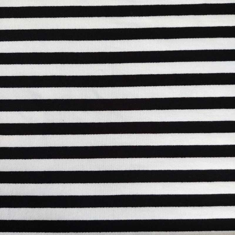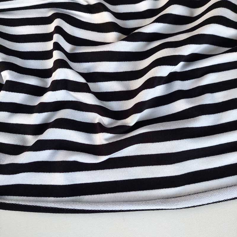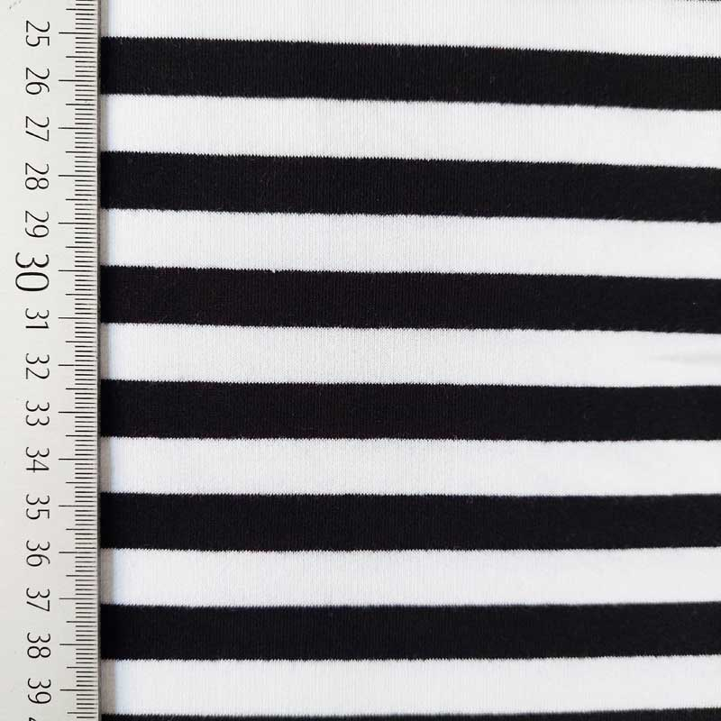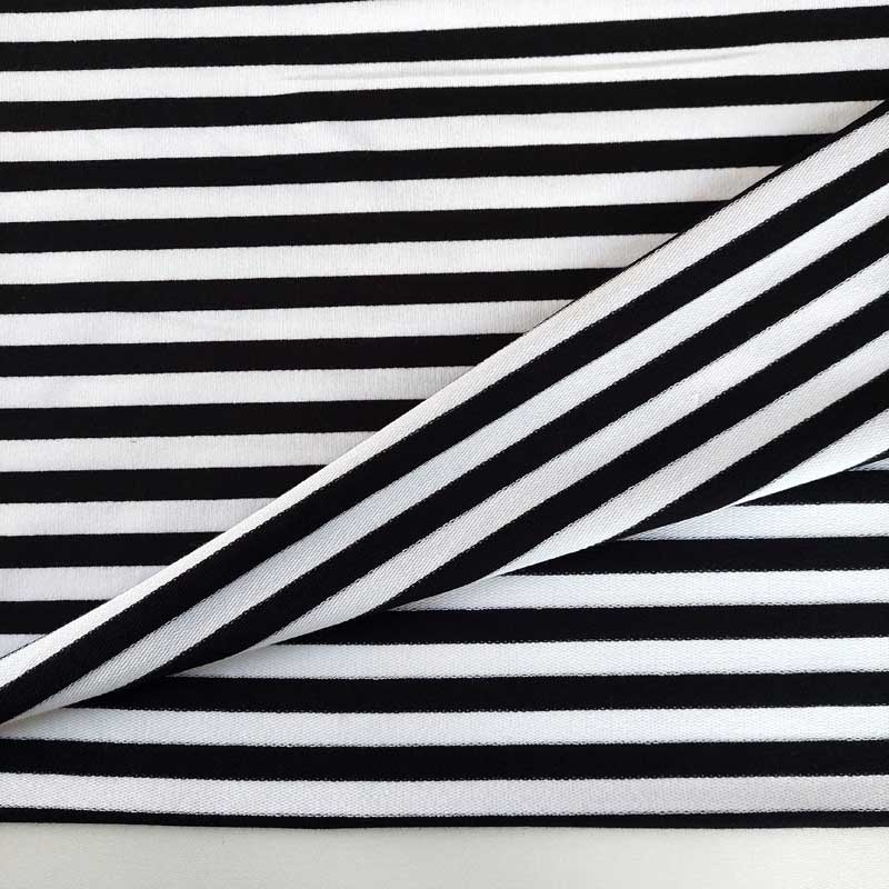 Dieser hochwertige French Terry Sweatstoff überzeugt durch sein zeitloses schwarz-weiß gestreiftes Design mit einer Streifenbreite von 1,3 cm. Die angenehm weiche, elastische Qualität bietet hohen Tragekomfort und ist zugleich formstabil und strapazierfähig. Dank der atmungsaktiven Sweatware eignet sich der Stoff ideal für jede Jahreszeit. Sie können daraus moderne Hoodies, Sweatshirts, Kleider, Röcke, Jogginghosen oder bequeme Kinderkleidung nähen. Auch für sportive Loungewear ist er perfekt. Wenn Sie French Terry Sweat Meterware kaufen, erhalten Sie einen vielseitigen Stoff für stilvolle Nähprojekte.