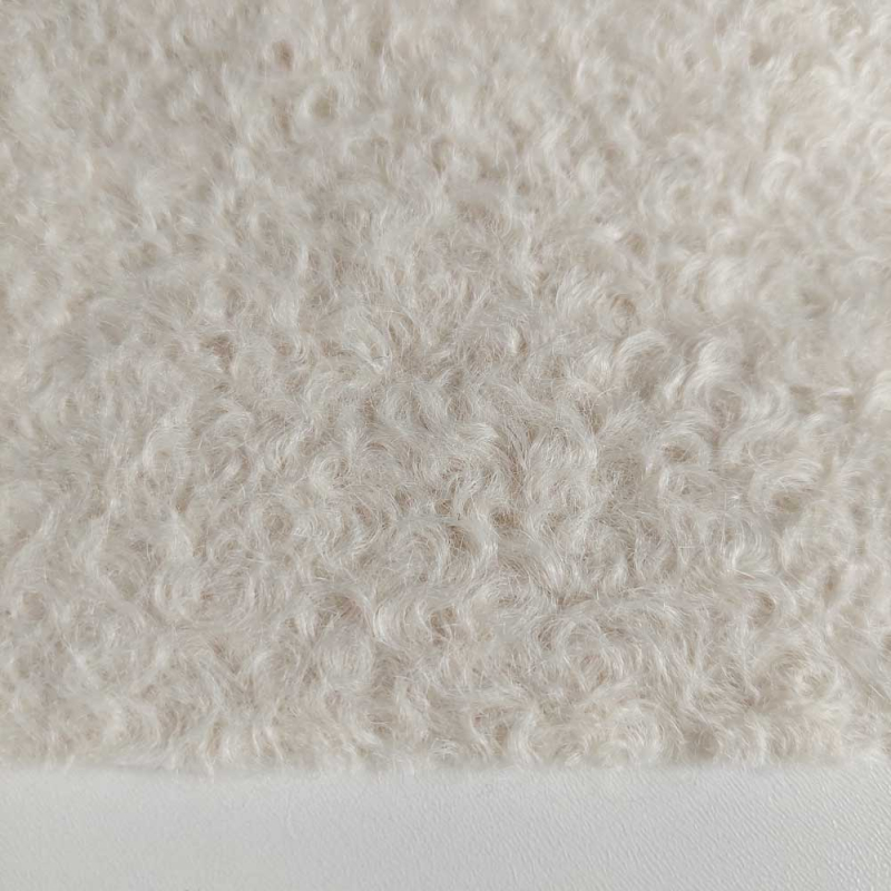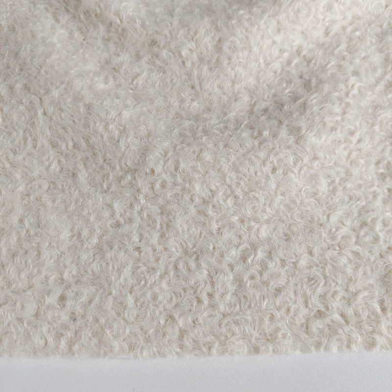 Ein dicker, cremeweißer Boucle Stoff. Der Stoff hat einen weichen dicken Griff und ausgeprägte Locken als Stoffoberfläche. Die Stoffrückseite ist glatt.