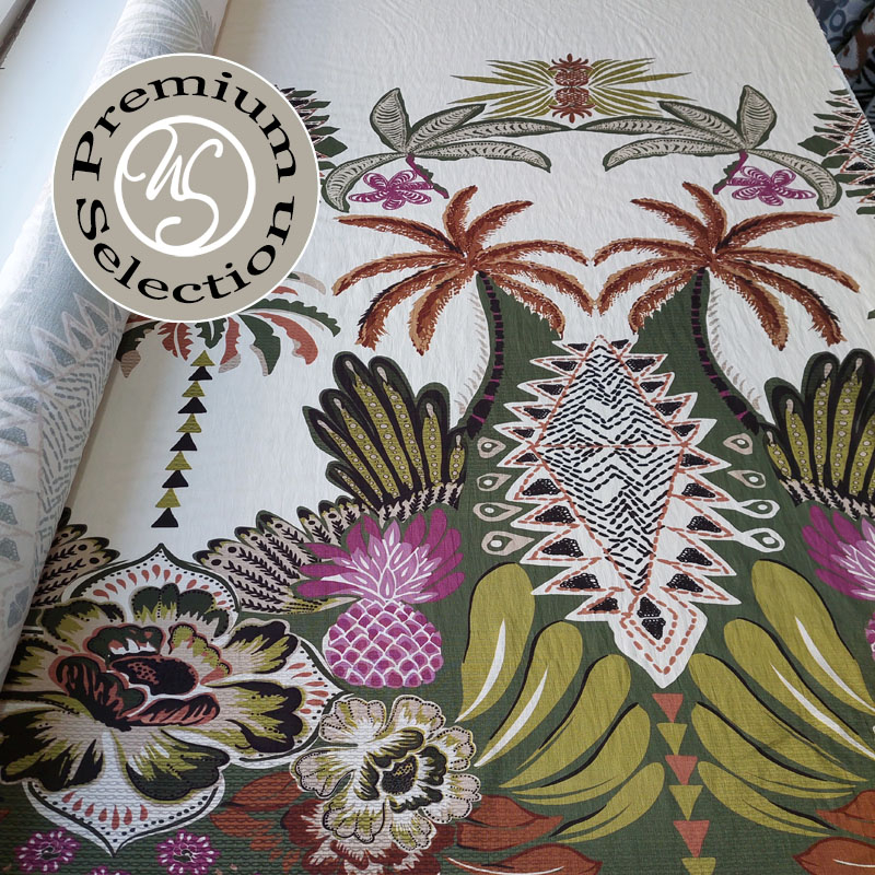 Der Viskosestoff aus Italien hat eine feine, leicht texturierte Oberfläche, ist weich und leicht. Die feine Webware hat einen fließenden Fall und liegt angenehm weich und locker auf der Haut. Das italienische Design als einseitiger Borderprint entlang der einen Webkante verleiht dem Stoff einen exquisiten Charakter und gibt dem fertigen Kleidungsstück einen eleganten, femininen Look. Der ecrue farbene Teil des Stoffes ist 42 cm hoch (gemessen vom Ende der Palme bis zur Webkante).
