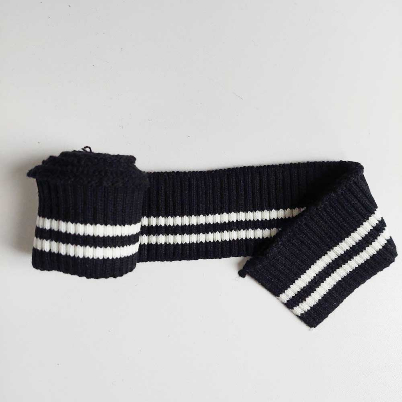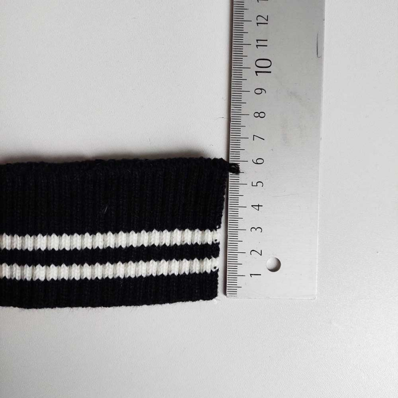Ein schwarzes Fertigbündchen im College Stil mit zwei cremeweißen Streifen. Das Strickbündchen ist im Rippenstrick gestrickt, hat eine fertige Kante und muss nur noch angenäht werden.
