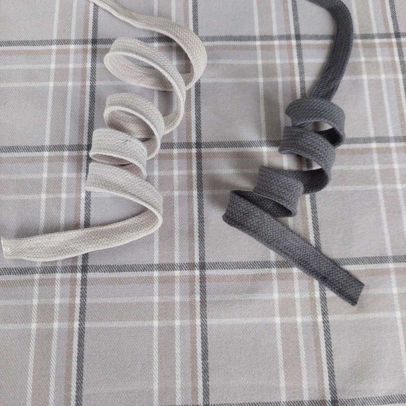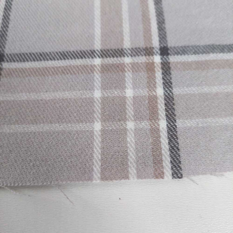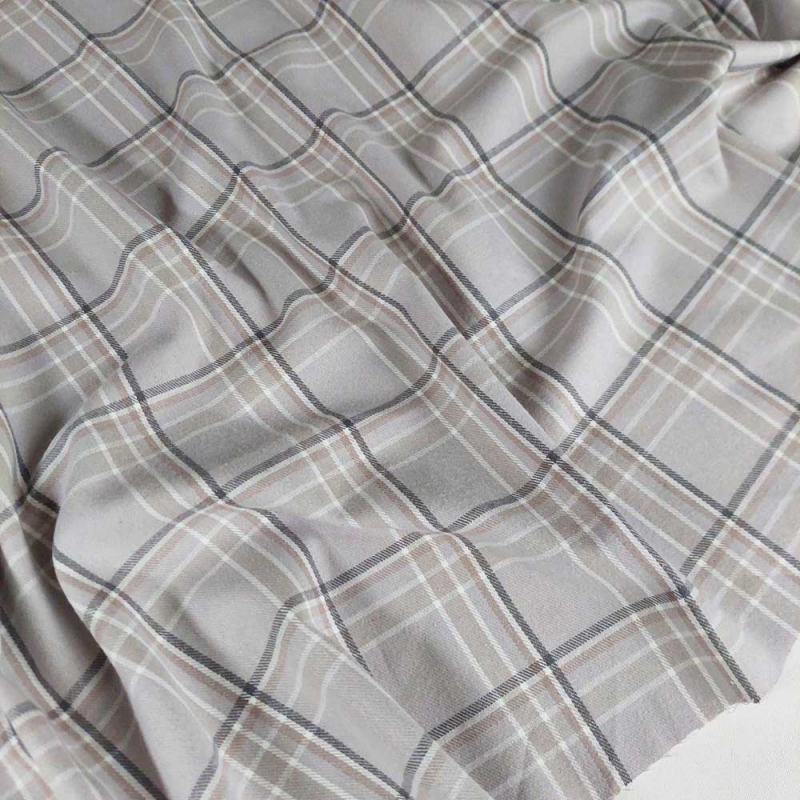 Ein hellgrauer leicht angerauter Flanellstoff mit beige, grau cremeweißem Karomuster. Der karierte Baumwollstoff hat eine leicht flauschige Oberfläche, ist unelastisch und lässt sich gut vernähen. Das Karomuster ist in den Stoff gewebt, d.h. Vorder- und Rückseite sehen gleich aus.