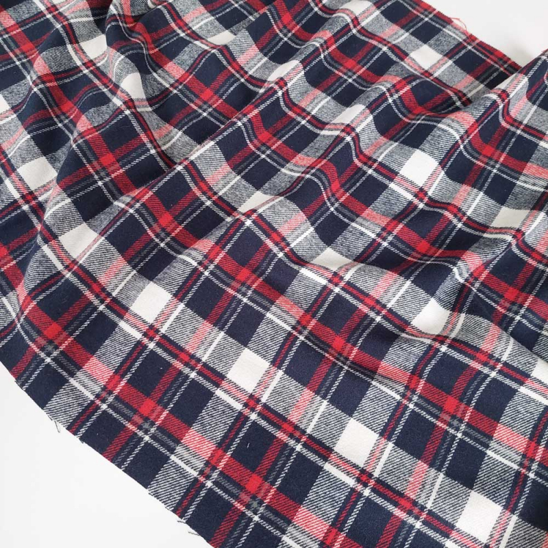 Ein leicht angerauter, garngefärbter Flanellstoff mit dunkelblau,rot cremeweißem Schottenkaro. Der karierte Baumwollstoff hat eine leicht flauschige Oberfläche, ist unelastisch und lässt sich gut vernähen. Das Karomuster ist in den Stoff gewebt, d.h. Vorder- und Rückseite sehen gleich aus.
