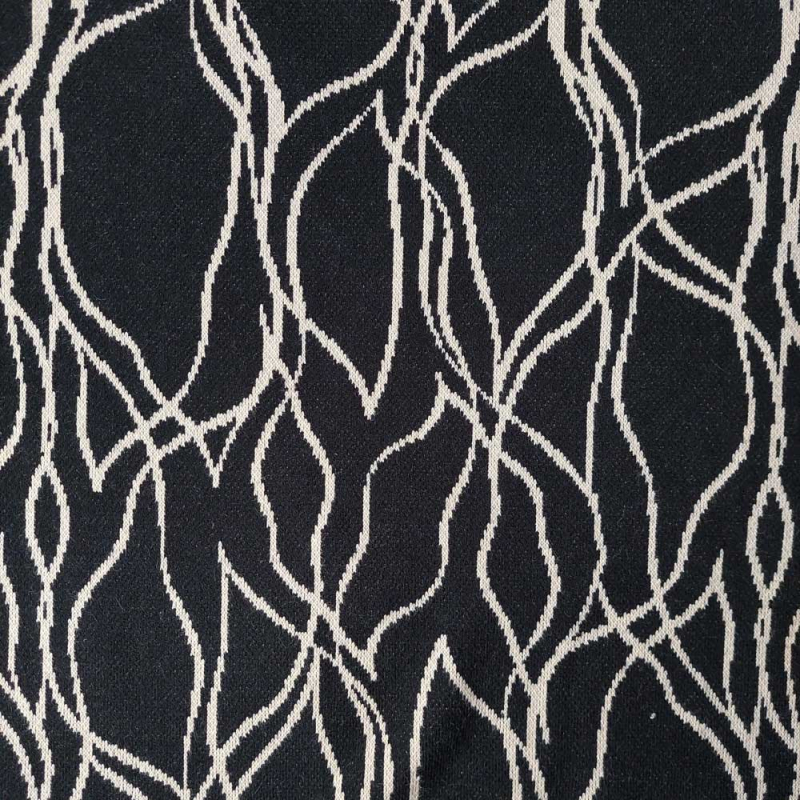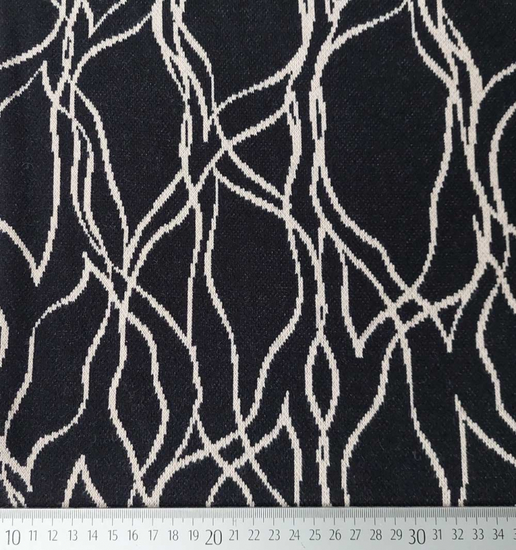 Ein eleganter schwarzer Jacquardstrickstoff mit eingewebten, beigen abstrakten Linien. Der Glattstrick ist weich im Griff und kratzt nicht.