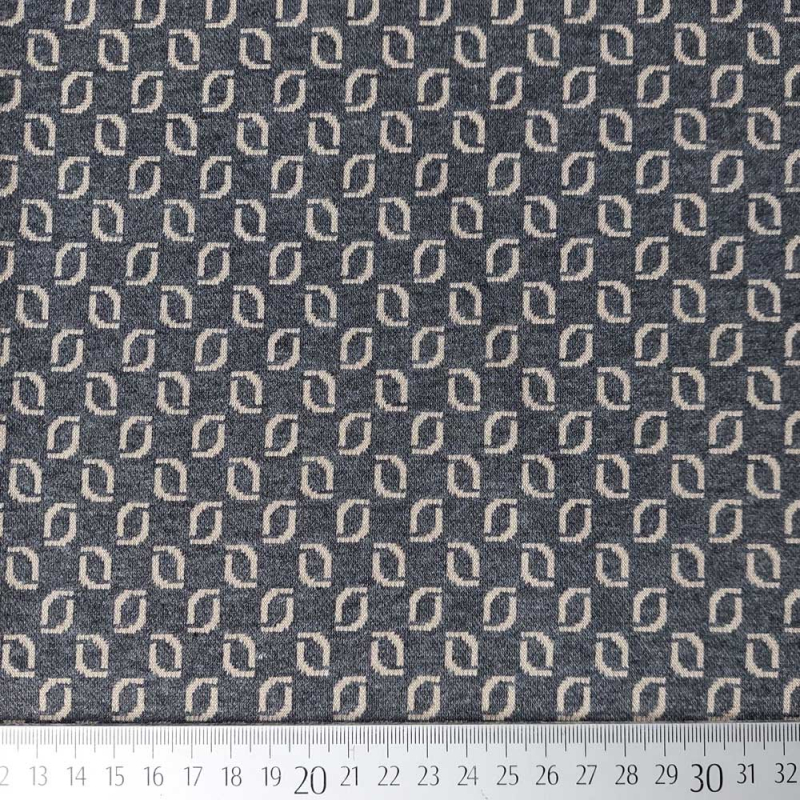 Ein eleganter grau melierter Jacquardstrickstoff mit eingewebten, beigen Kringeln. Der Glattstrick ist weich im Griff, leicht elastisch und kratzt nicht.