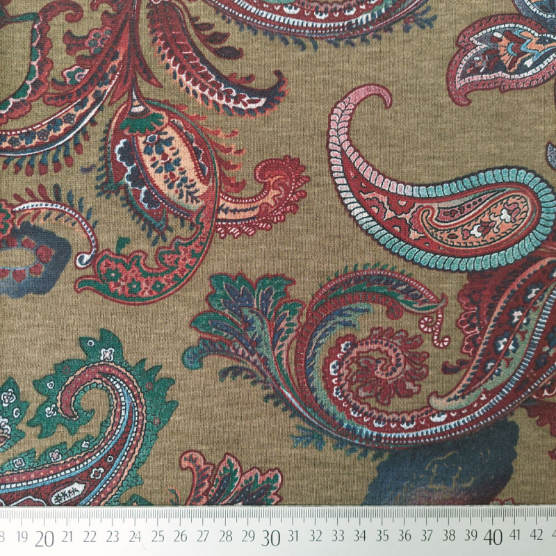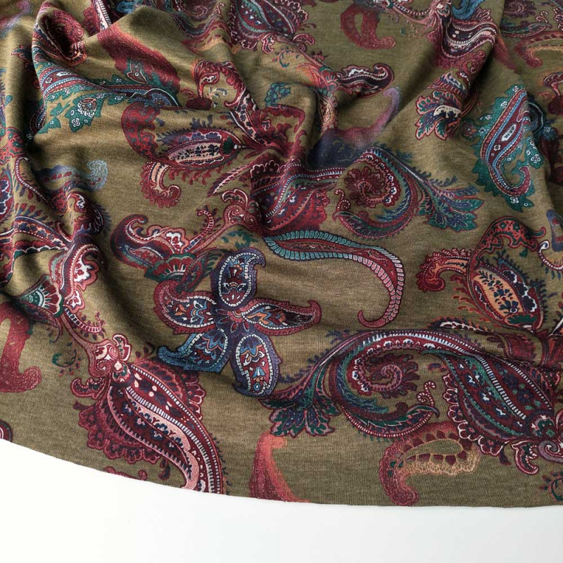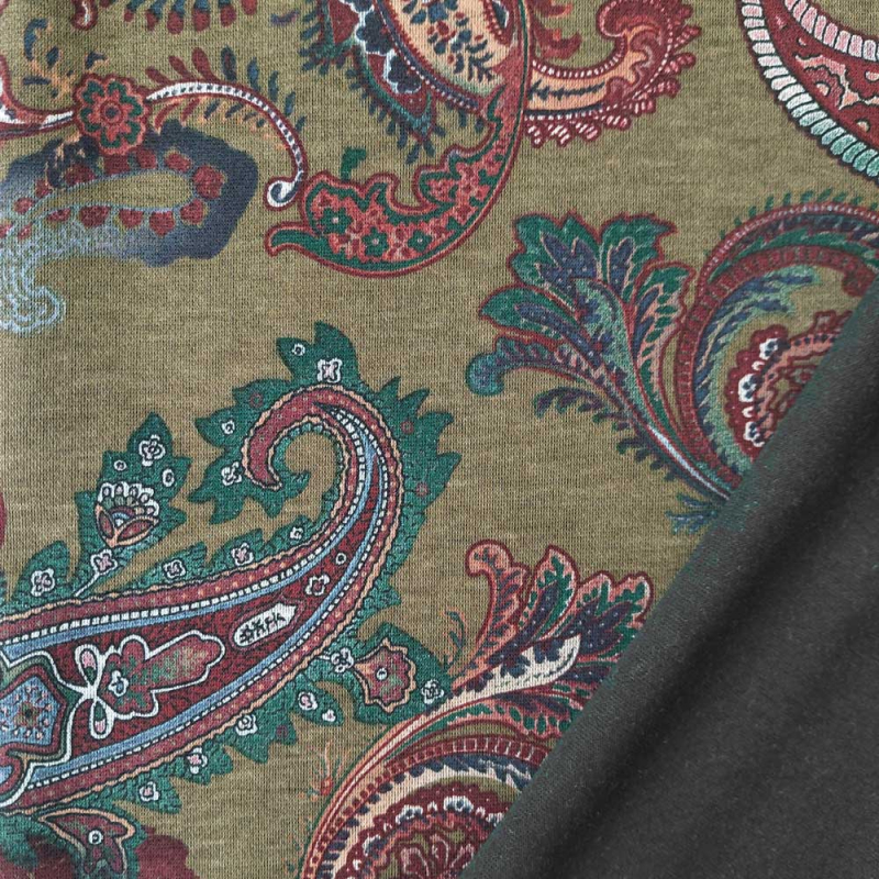 Ein khakigrüner Punto di Roma Jerseystoff bedruckt mit weinrotem Paisleymuster. Der Stoff ist weich im Griff und fällt gut. Die Rückseite ist schwarz.