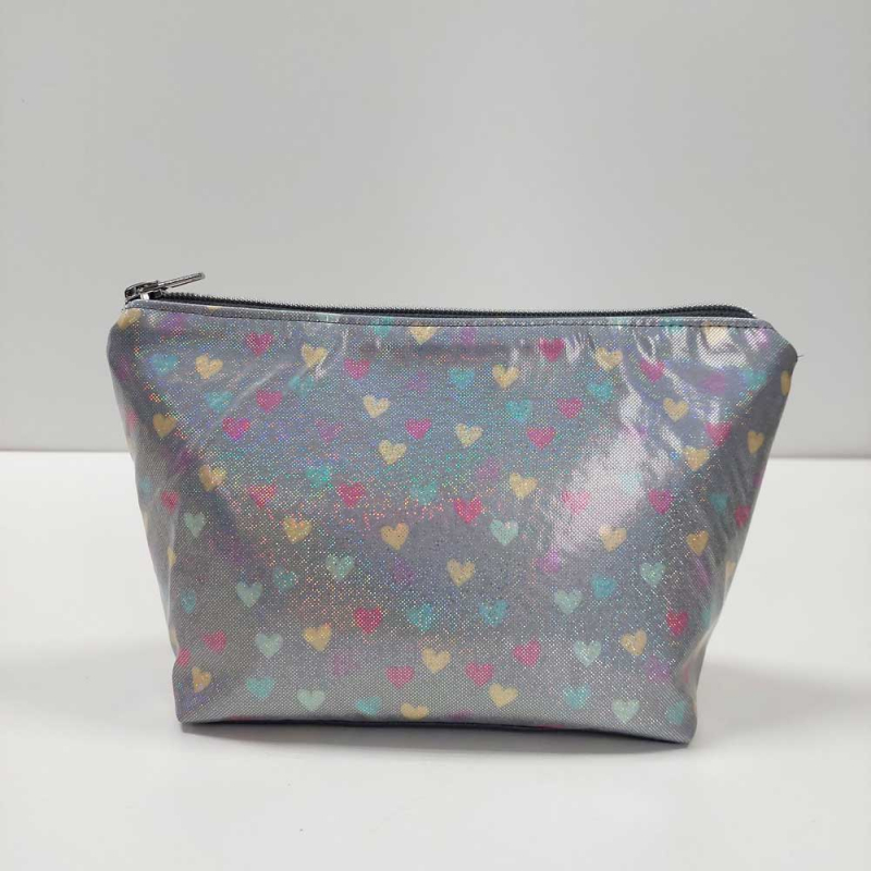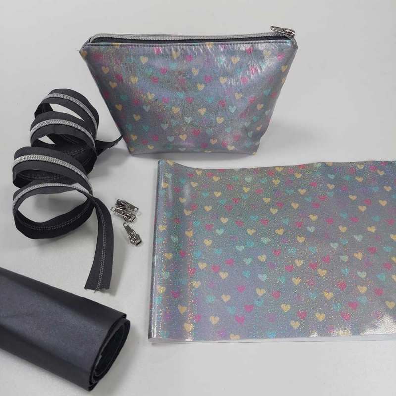Ein grauer Regenmantelstoff bedruckt mit bunten Herzen und Regenbogen-Glitzer als Foliendruck. Der Stoff ist windicht, wasser- und schmutzabweisend. Flecken einfach abwischen. Die Rückseite ist weiß.