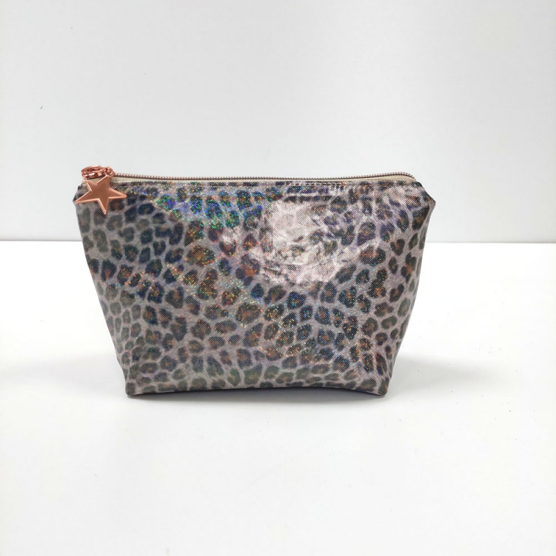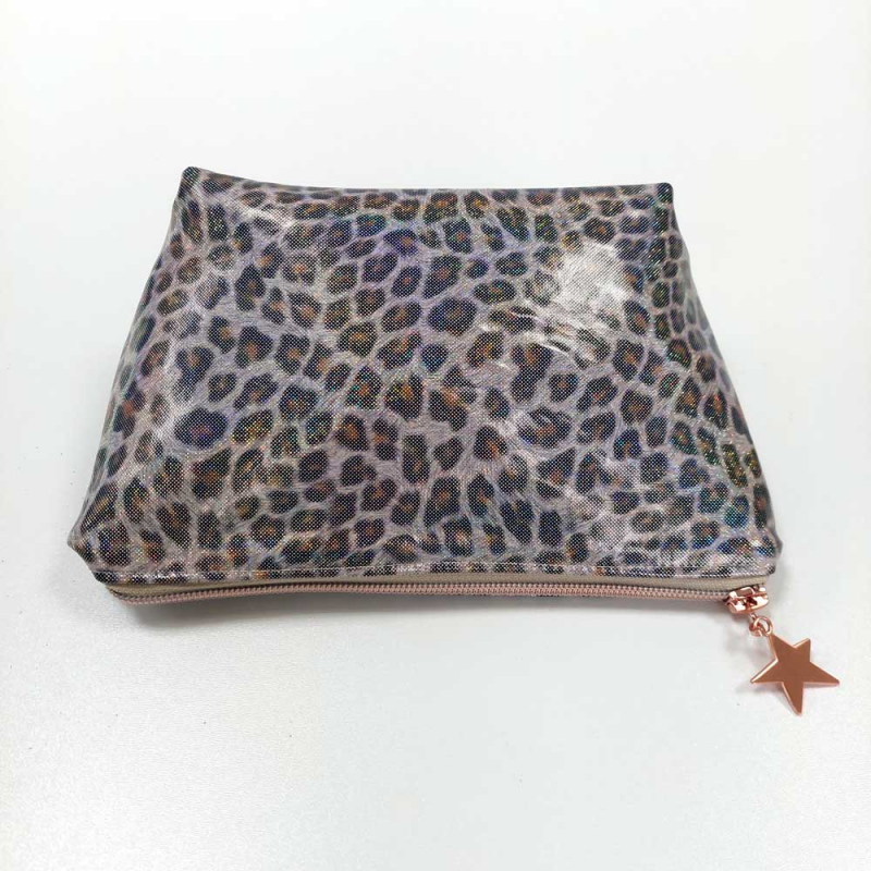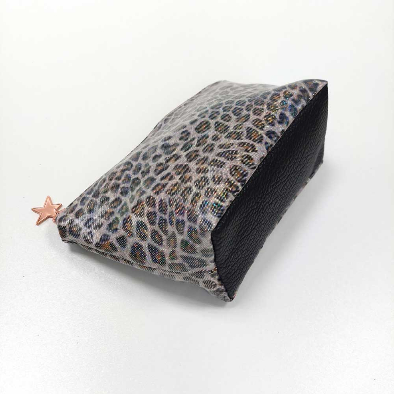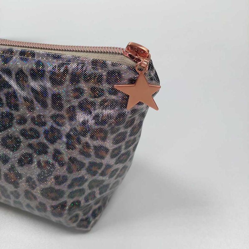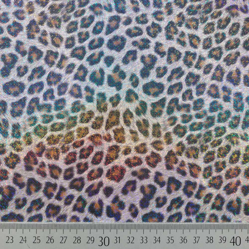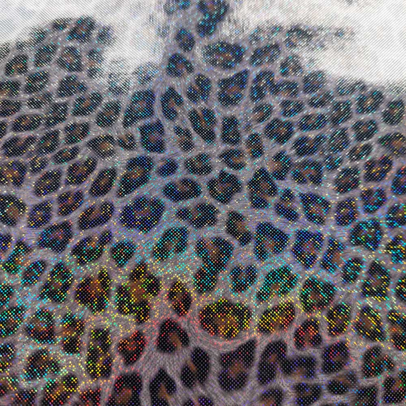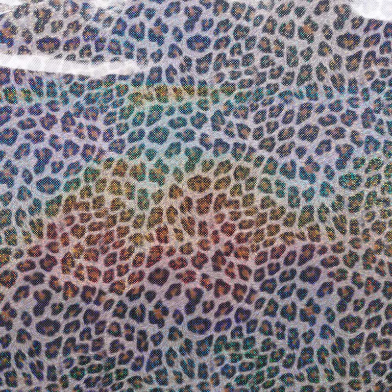 Ein super cooler Regenmantelstoff mit schwarz braunem Leopardenmuster und Regenbogen-Glitzer als Foliendruck. Der Stoff ist windich, wasser- und schmutzabweisend. Flecken einfach abwischen. Die Rückseite ist weiß.