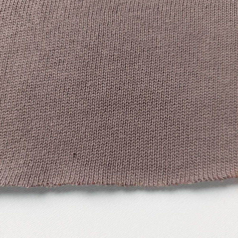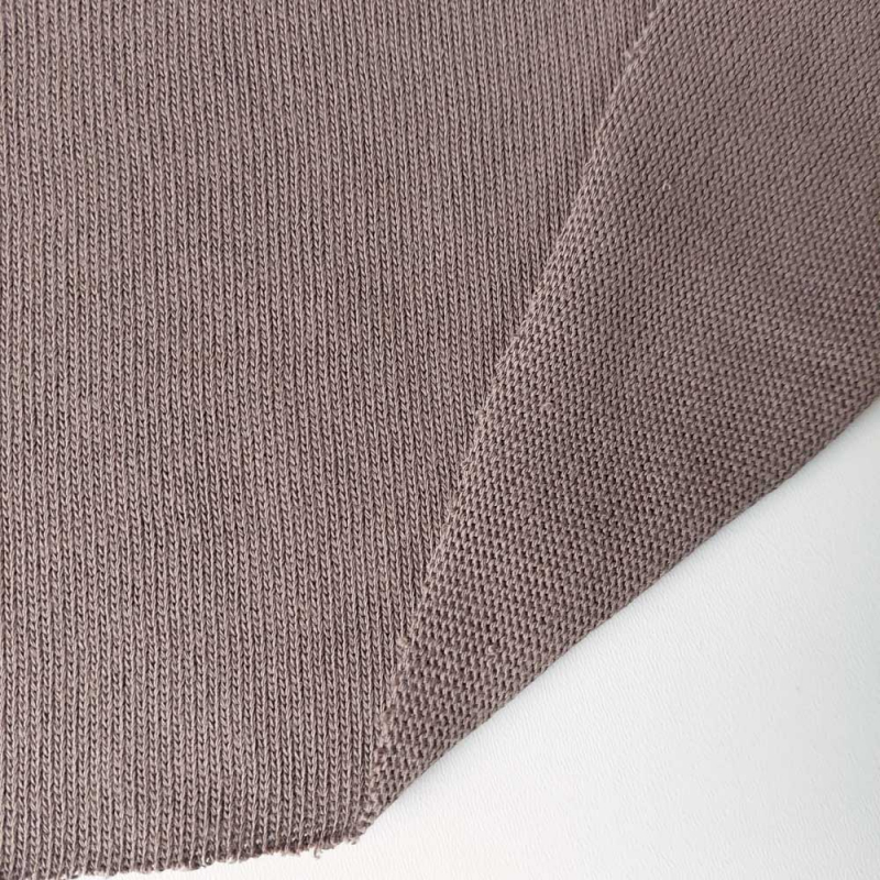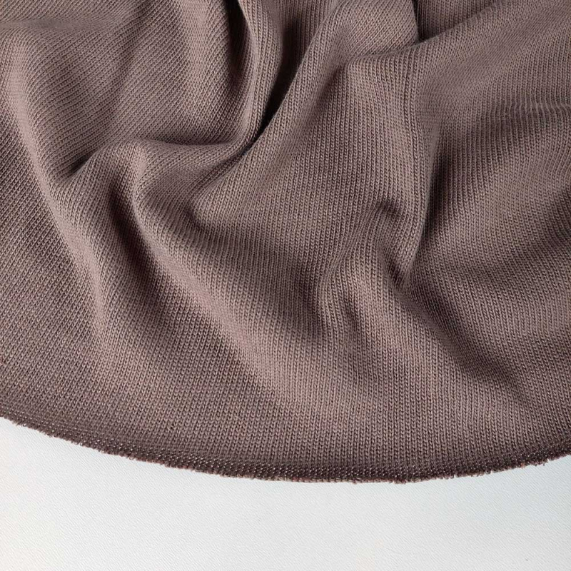 Ein matt dunkelbrauner Strickstoff aus reiner Baumwolle als Glattstrick . Dieser gestrickte Baumwollstoff fällt weich und kratzt nicht.