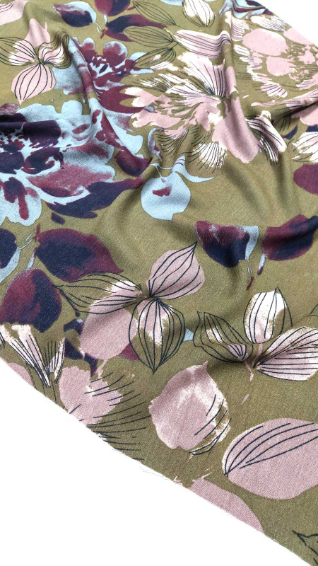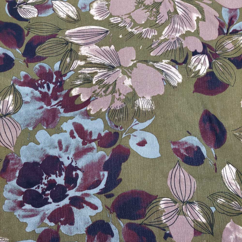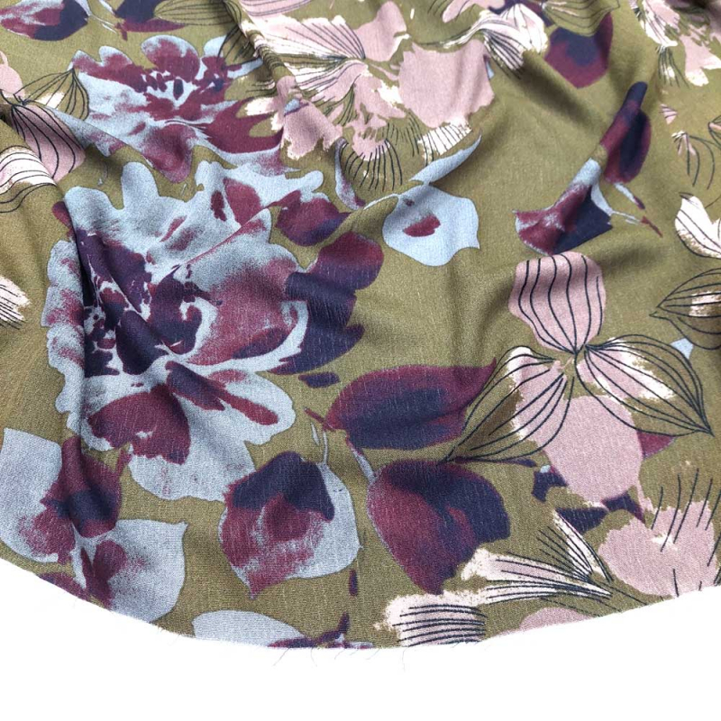 Tauchen Sie ein in die Welt zarter Stoffträume: Unser olivgrüner Viskose-Kreppstoff mit burgundy, dunkelblauen und altrosa Blumen vereint natürliche Eleganz mit einem Hauch von Boho-Romantik.