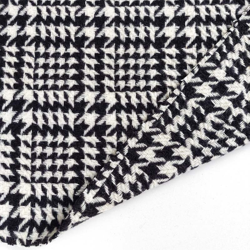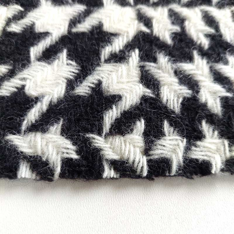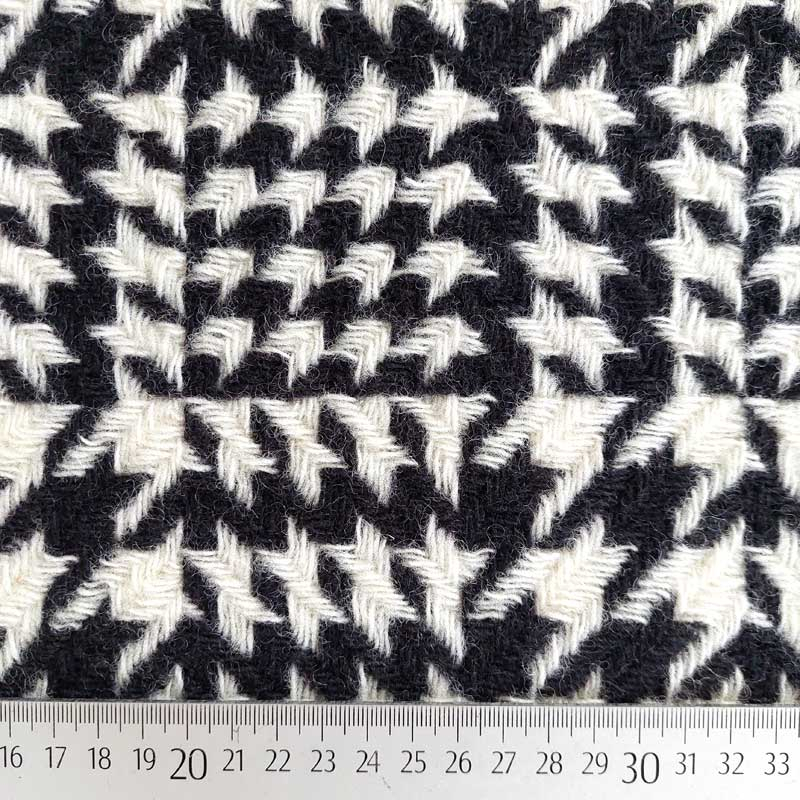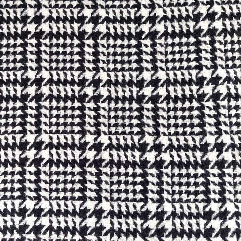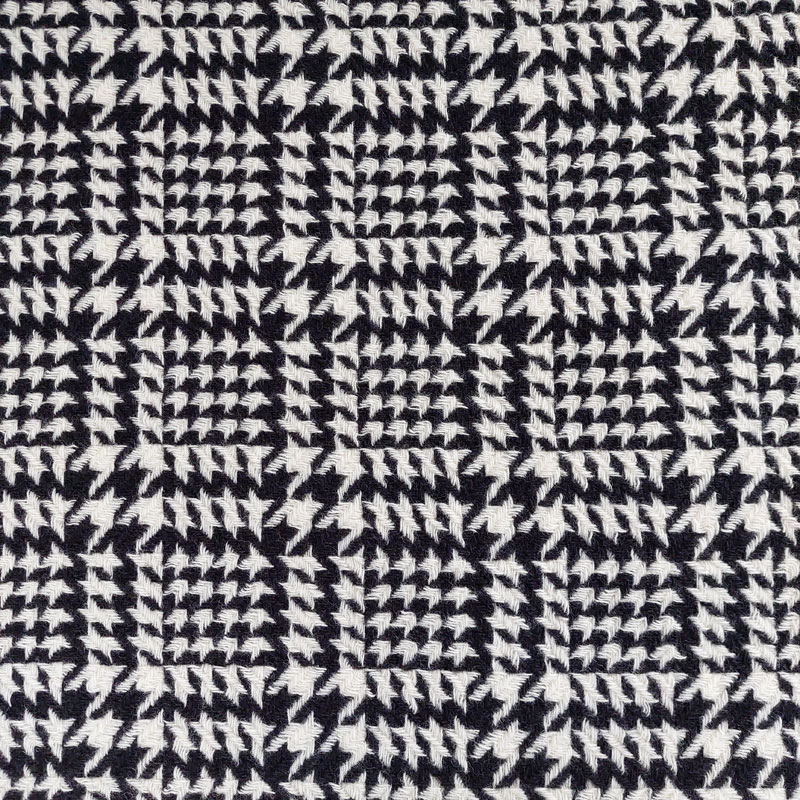 Es handelt sich um limitierten Designer-Deadstock, der ursprünglich für eine exklusive Modekollektion produziert wurde. Die Jacquard-Webtechnik sorgt für ein präzise eingewebtes Hahnentrittmuster (Pied de Poule) mit klaren Konturen und edler Struktur. Vorder- und Rückseite sehen gleich aus.