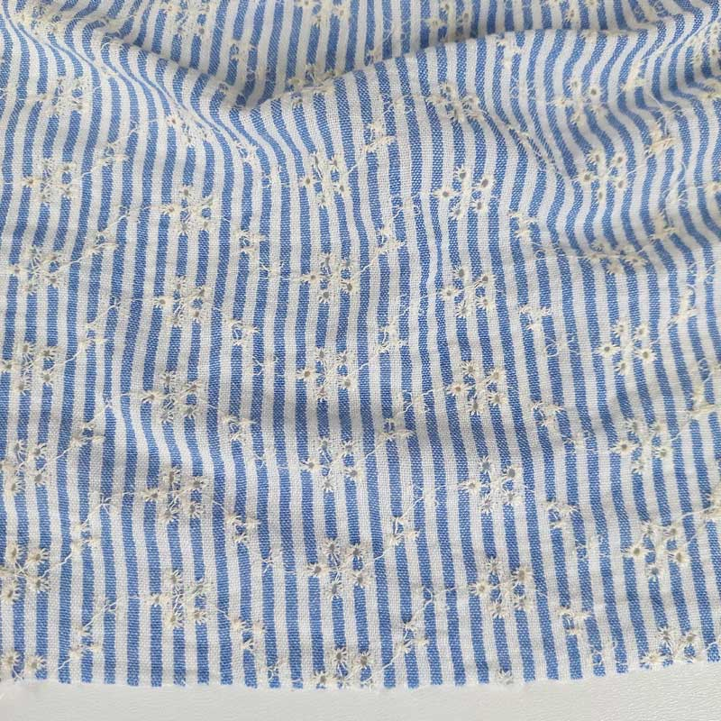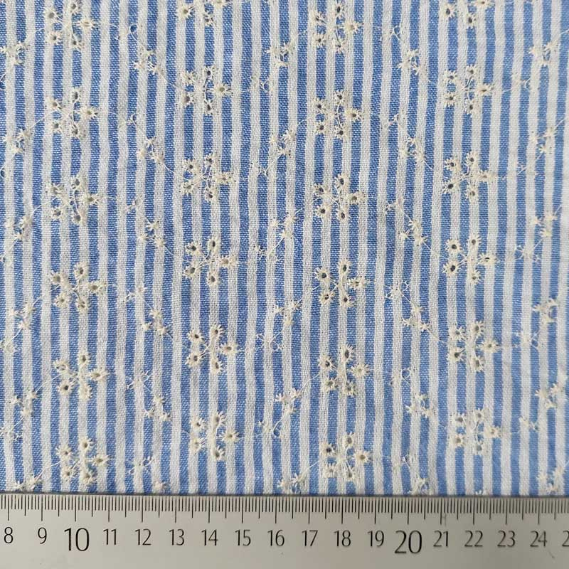 Wenn Sie auf der Suche nach einem hochwertigen, sommerlichen Baumwollstoff Streifen Lochstickerei Damen sind, treffen Sie mit diesem Modell eine ausgezeichnete Wahl. Die Kombination aus blau weiße schmale Streifen, edler Blumenstickerei und 100 % Baumwolle macht diesen Stoff zu einem vielseitigen Klassiker für Ihre Nähideen.