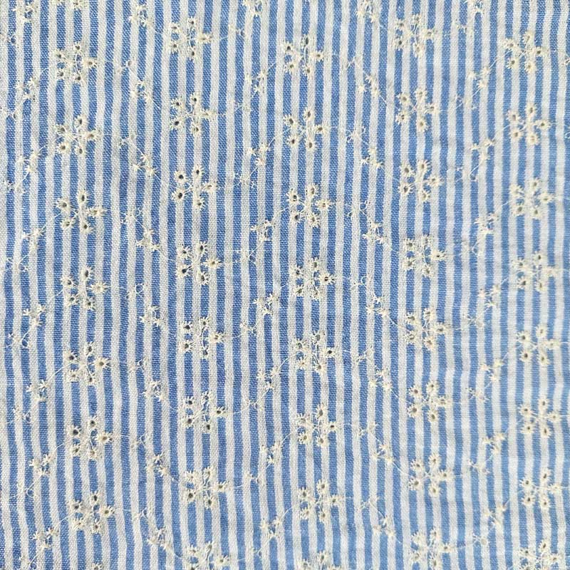 Der bestickte Baumwollstoff kombiniert also zwei klassische Elemente: Streifen und florale Lochstickerei. Die Naturfarbe der Stickerei harmoniert wunderschön mit dem Mittelblau und Weiß und sorgt für einen dezenten, hochwertigen Look. Die Stickerei wirkt weder verspielt noch aufdringlich, sondern stilvoll und elegant – ideal für alle, die klassische Mode mit einem Hauch Romantik lieben.