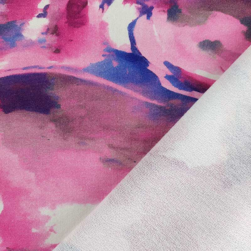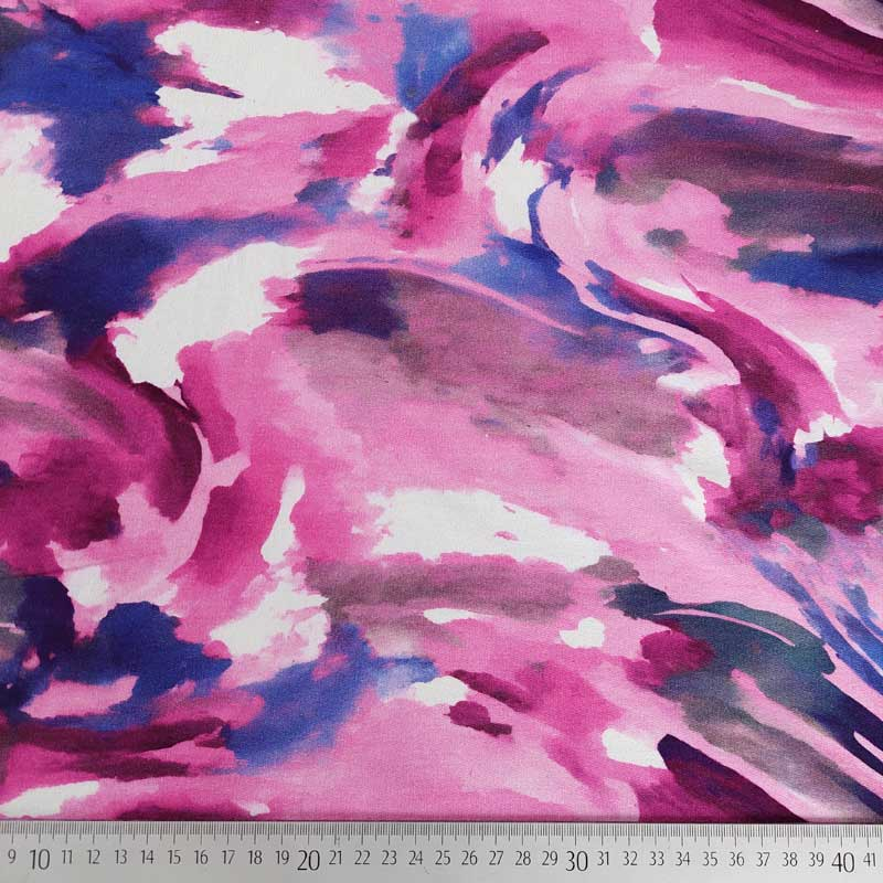 Ein French Terry Sweatstoff bedruckt abstraktem Muster in Pink- und Beretönen sowie Blau.