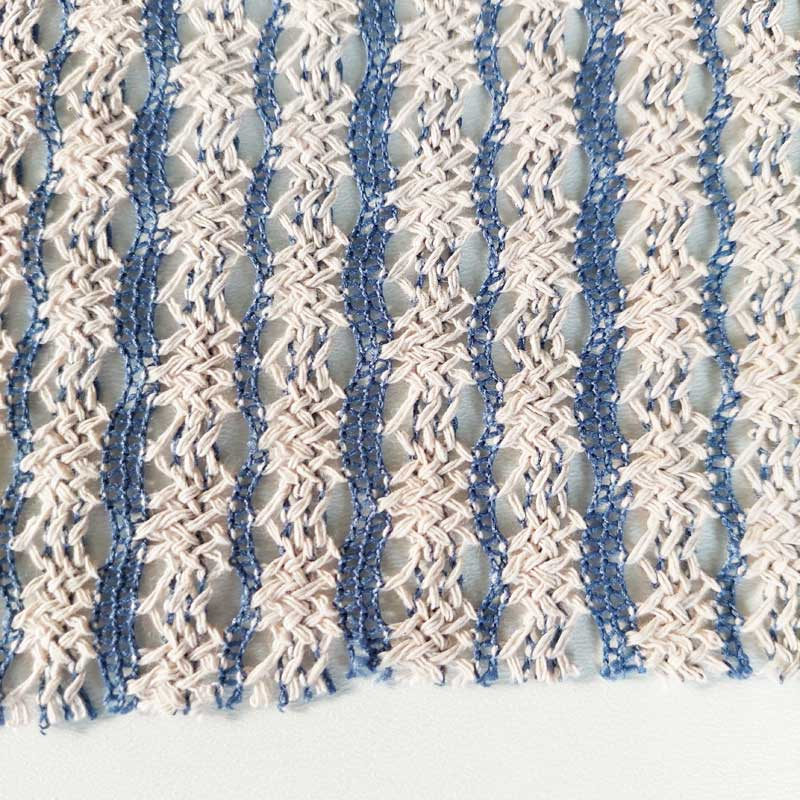 Entdecken Sie unseren hochwertigen Häkelstoff als Meterware im modernen Streifen-Design in Beige und coolem Jeansblau. Die dekorative Häkel-Optik im Crochet-Look verleiht dem Stoff eine besondere Struktur und einen natürlichen, modischen Charakter. Dank seiner luftigen, leicht transparenten Beschaffenheit eignet sich dieser Boho Stoff ideal für sommerliche Kleidung wie Tops, Tuniken, Kleider oder leichte Jacken.