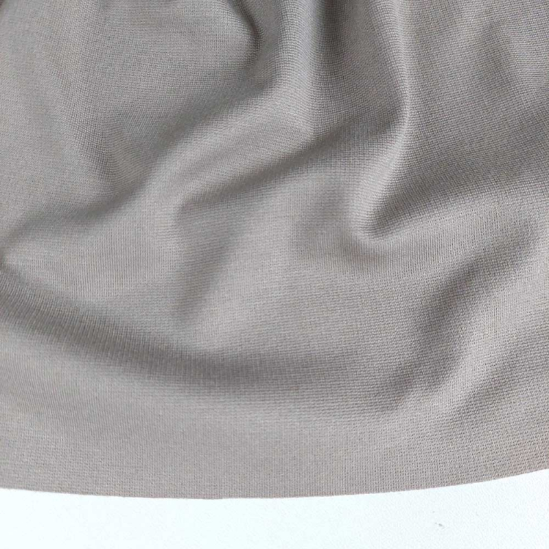 Ein schwerer und hochwertiger, taupe (graubeiger) Punto di Roma Jerseystoff mit zwei rechten Seiten (2-lagig). Der Stretchjersey fällt weich und durch seine Schwere ist er super geeignet figurnahe Kleidung, denn er schmiegt sich an, aber kaschiert das ein oder andere Pölsterchen, so dass sich Rundungen nicht so leicht abzeichnen.