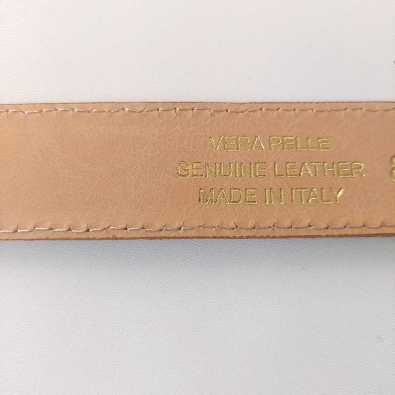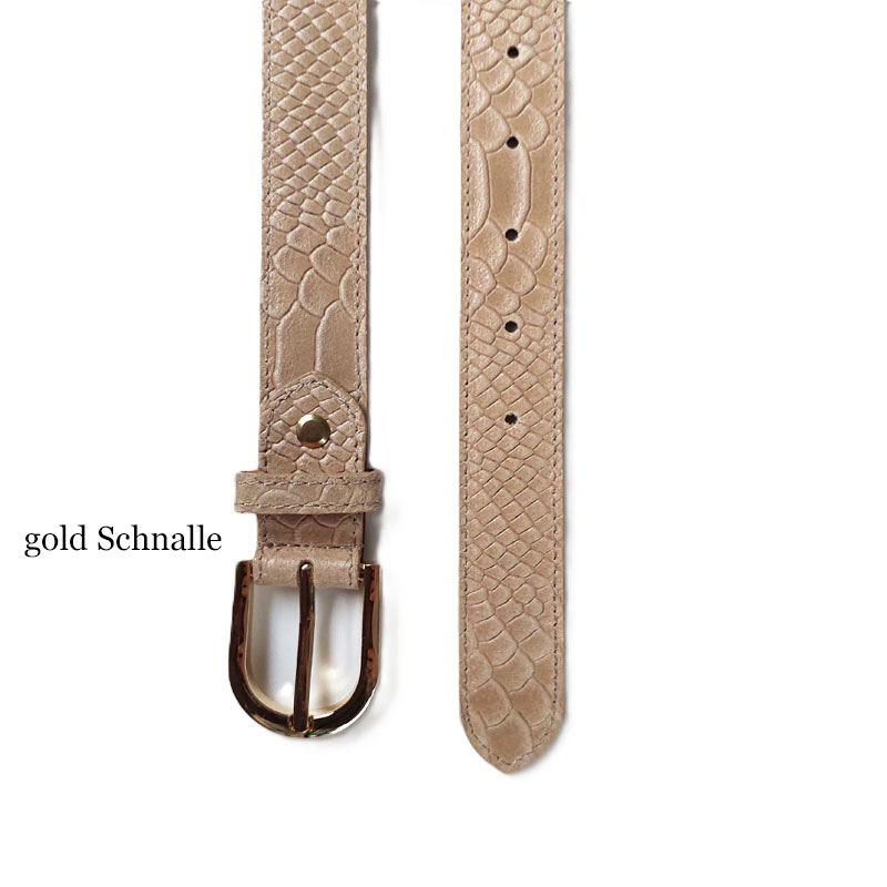 Ein klassischer hellbeiger Ledergürtel mit Kroko-Prägung und goldener Schnalle. Der Gürtel hat 5 Löcher, das erste Loch beginnt 10,5 cm ab dem Gürtelanfang, die Abstände zwischen den Löchern sind 2,5 cm.