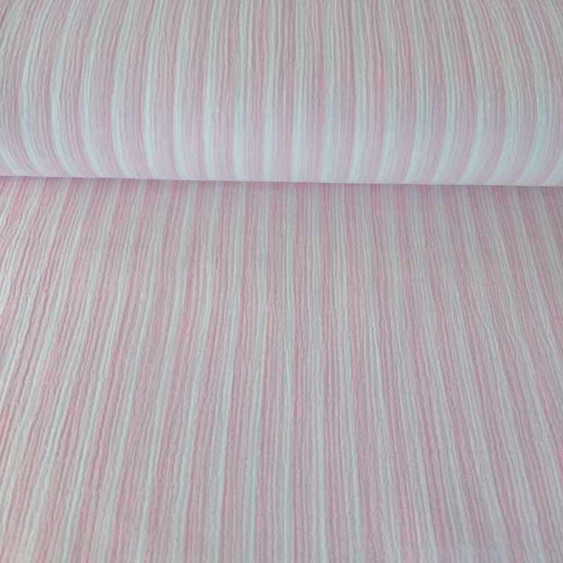Ein besonderes Highlight dieses Musselins ist die Doubleface-Optik. Eine Stoffseite zeigt breitere rosa Streifen auf cremeweißem Grund, die andere Seite ist mit schmaleren Streifen gestaltet. So erhalten Sie zwei unterschiedliche Designs in einem Stoff – ideal für kreative Nähideen.