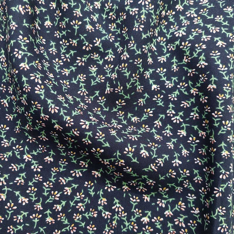 Es handelt sich um ein Reststück der Größe 90 cm (L) x 145 cm (B). Ein dunkelblauer Viskosestoff bedruckt mit kleinen,weinroten Streublümchen und grünen Blättern. Als Viskose Popelin ist der Stoff fein, leicht und weich mit einer seidig weichen Oberfläche. Die Stoffrückseite ist nicht bedruckt.