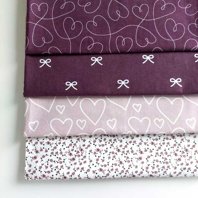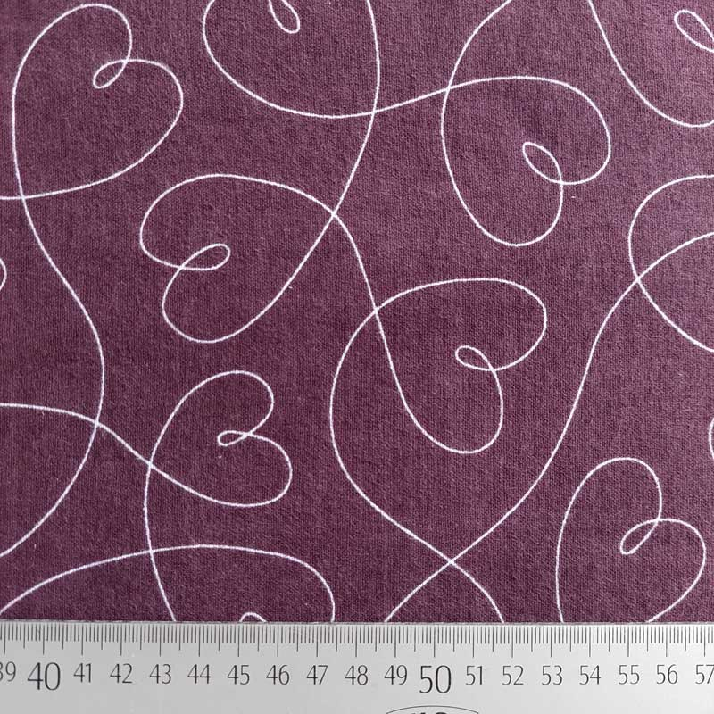 Ein burgundy Flanellstoff bedruckt mit weißen Herzen. Der Baumwollstoff hat eine leicht flauschige Oberfläche, ist unelastisch und lässt sich gut vernähen. Die Stoffrückseite ist weiß.