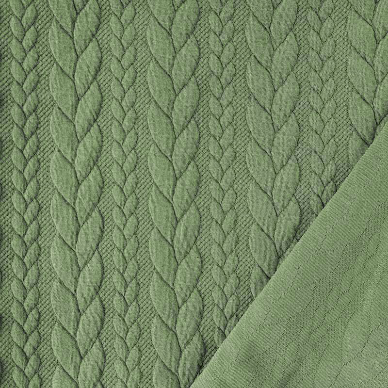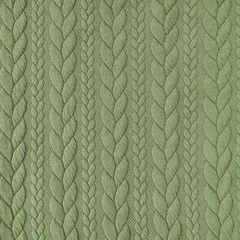 Ein weicher Jacquard Jerseystoff mit klassischem Zopfmuster in der Trendfarbe Matcha Green. Der Stoff ist elastisch und dehnt sich leicht.