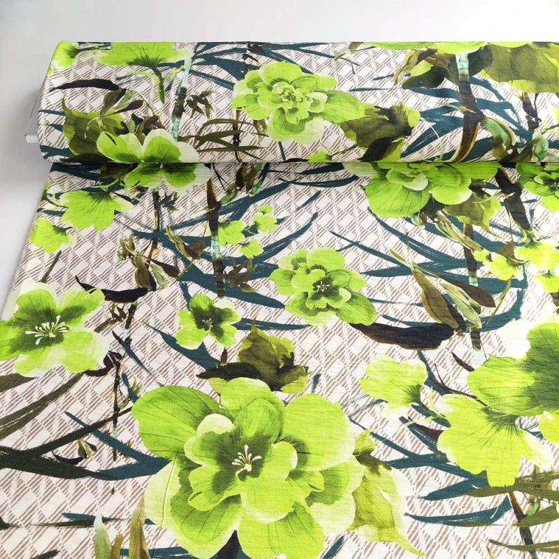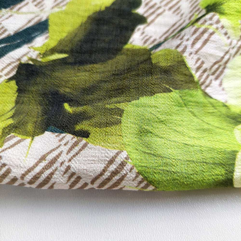 Viskose Krepp Stoff Sommerstoff Meterware Blumen Blätter Druck, limegreen hellbeige