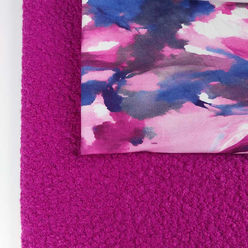 Ein French Terry Sweatstoff bedruckt abstraktem Muster in Pink- und Beretönen sowie Blau.