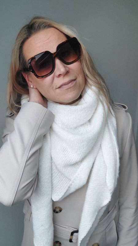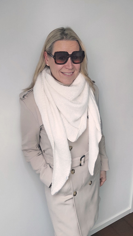 Ein flauschig weicher cremeweißer Schal als Dreieck. Der Schal hat einen super weichen dicken Griff und ist sehr angenehm auf der Haut. Die Ränder sind mit Handstich verziert.