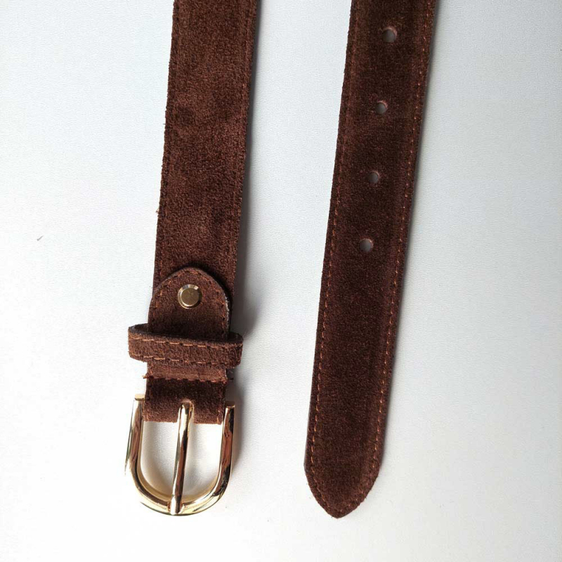 Ein klassischer dunkelbrauner Wildledergürtel mit goldener Schnalle. Der Gürtel hat 5 Löcher, das erste Loch beginnt 10,5 cm ab dem Gürtelanfang, die Abstände zwischen den Löchern sind 2,5 cm.