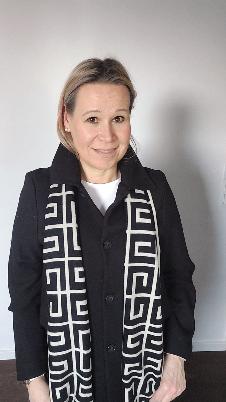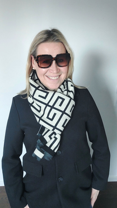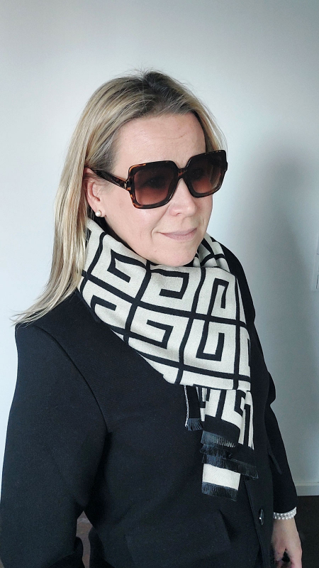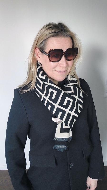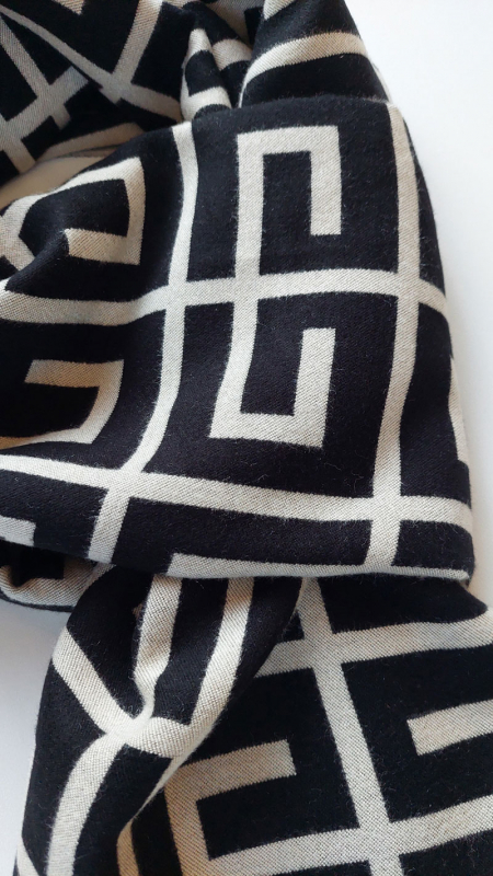 Ein schwarzes Halstuch aös Doubleface mit eingewebten, hellbeigem Labyrinthmuster.