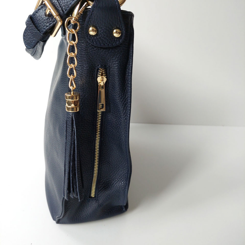 Entdecken Sie die zeitlose Eleganz unserer eleganten Handtasche aus hochwertigem Leder mit genarbter Oberfläche und edlem Lederriemen als Taschengriff. Die vielen Metalldetails wie goldene runde Nieten, die goldenen Metallreißverschlüsse an den Seiten und die Quaste als Tascheanhänger werten die Tasche enorm auf. Auch die goldenen Verstellschnallen für den Riemen und die Ringe geben der Tasche das gewisse Etwas.