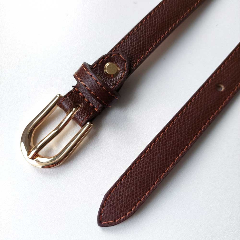 Ein brauner Ledergürtel mit fein gepägter Optik auf der Oberseite. Der Gürtel hat 5 Löcher, das erste Loch beginnt 10,5 cm ab dem Gürtelanfang, die Abstände zwischen den Löchern sind 2,5 cm.