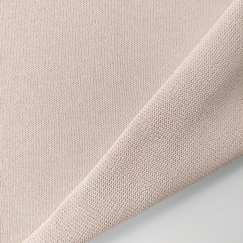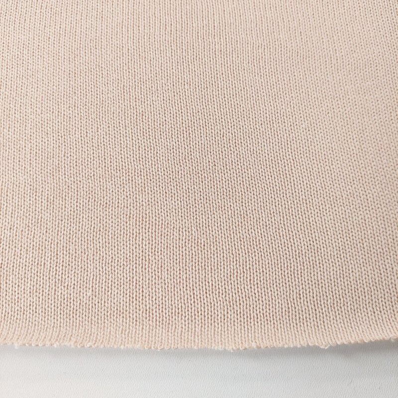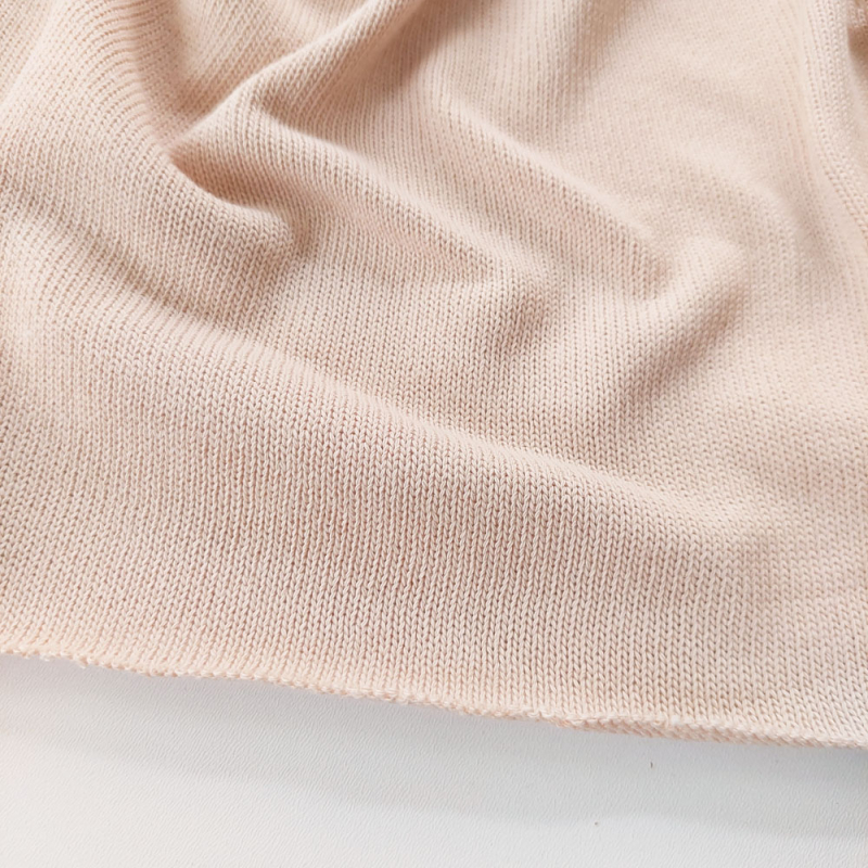 Ein hellbeiger, glatter Strickstoff. Der Strickstoff ist dicht mit einem weichen Griff, leicht elastisch und und fällt weich. Der Tragekomfort ist enorm gut.