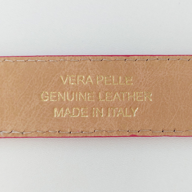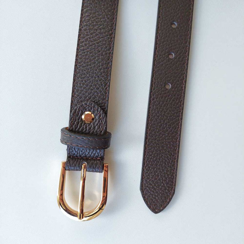 Ein klassischer dunkelbrauner Ledergürtel in geprägter Optik und goldener Schnalle. Der Gürtel hat 5 Löcher, das erste Loch beginnt 10,5 cm ab dem Gürtelanfang, die Abstände zwischen den Löchern sind 2,5 cm.