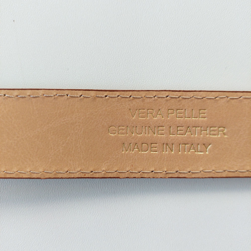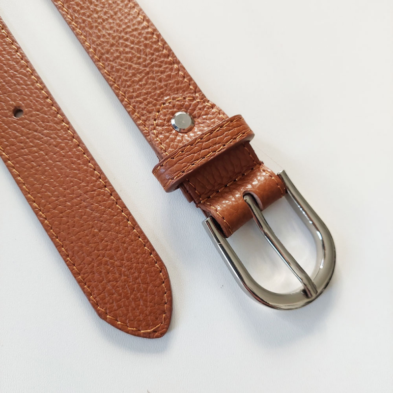 Ein klassischer einfarbiger Ledergürtel für Damen in cognac braun mit silberner Schnalle. Der Gürtel hat 5 Löcher, das erste Loch beginnt 10,5 cm ab dem Gürtelanfang, die Abstände zwischen den Löchern sind 2,5 cm.