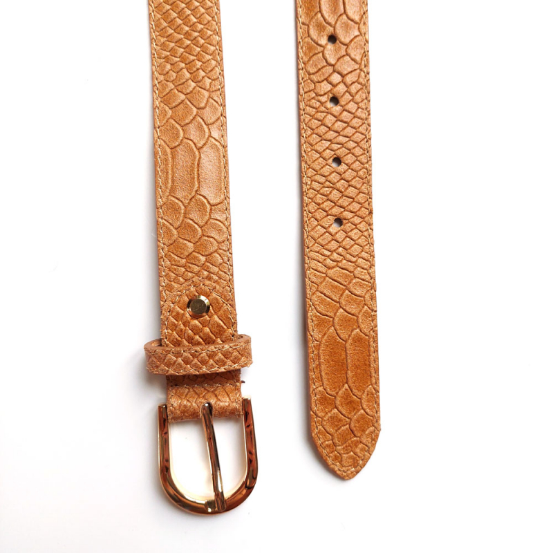 Ein klassischer camel Ledergürtel mit Kroko-Prägung und goldener Schnalle. Der Gürtel hat 5 Löcher, das erste Loch beginnt 10,5 cm ab dem Gürtelanfang, die Abstände zwischen den Löchern sind 2,5 cm.