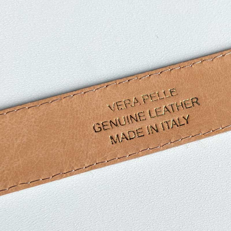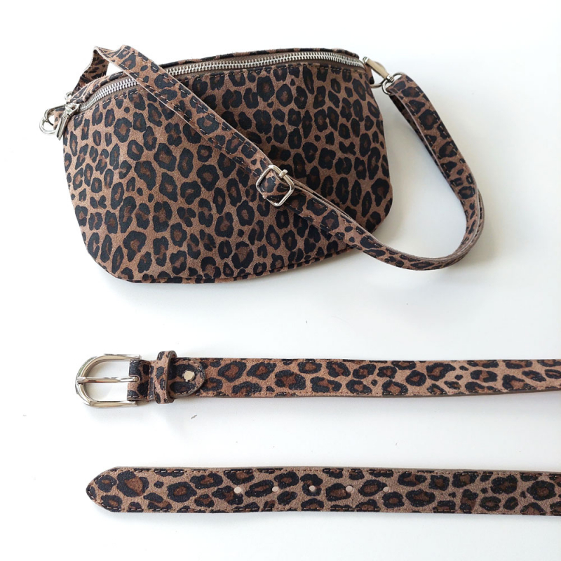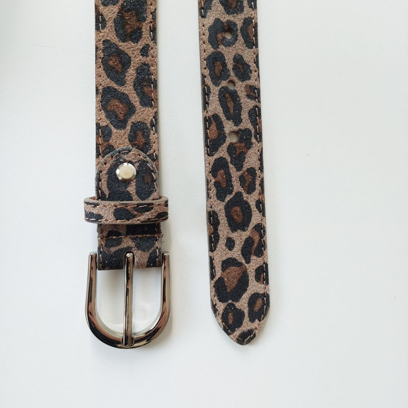 Ein trendiger brauner Wildledergürtel mit kleinem, schwarz-braunem Leopardenmuster mit silberner Schnalle. Der Gürtel hat 5 Löcher, das erste Loch beginnt 10,5 cm ab dem Gürtelanfang, die Abstände zwischen den Löchern sind 2,5 cm.