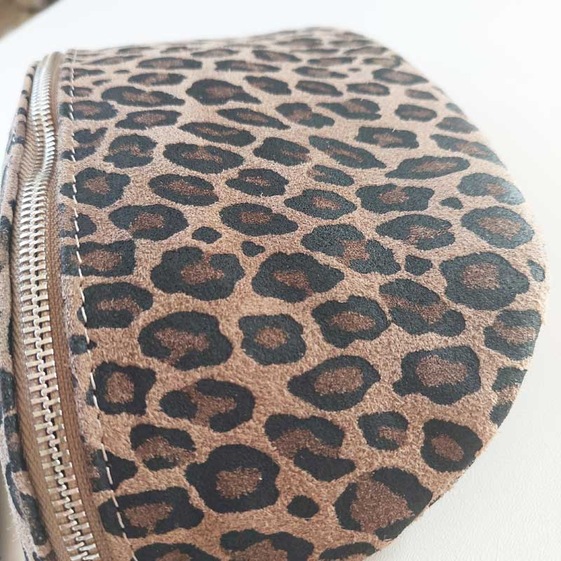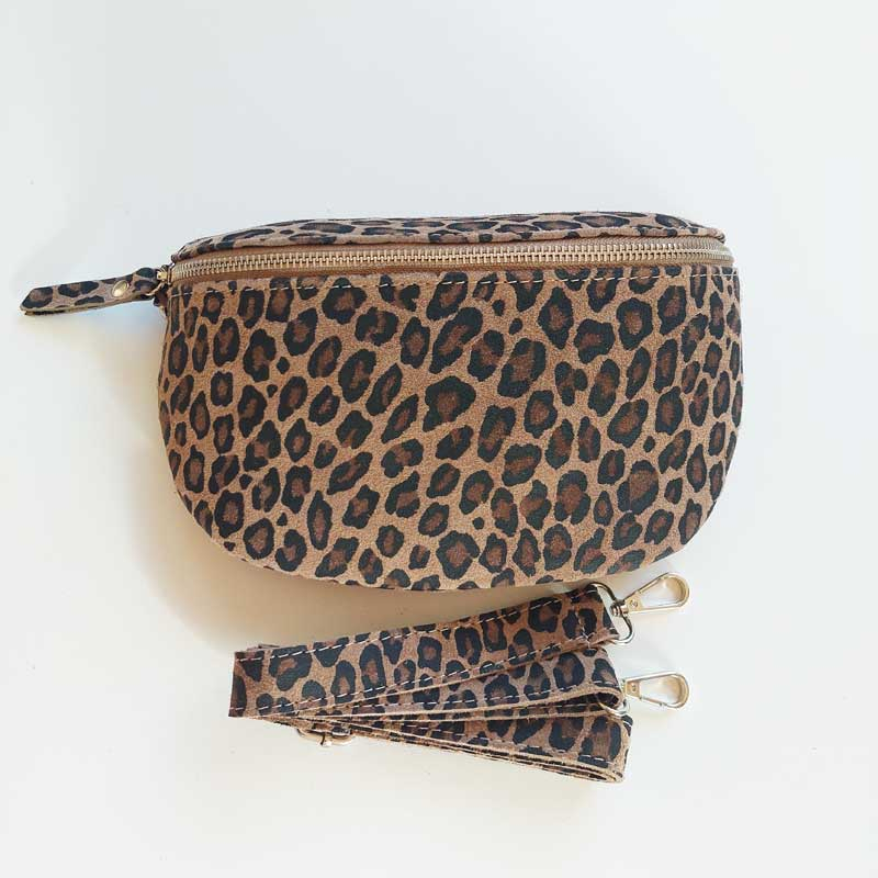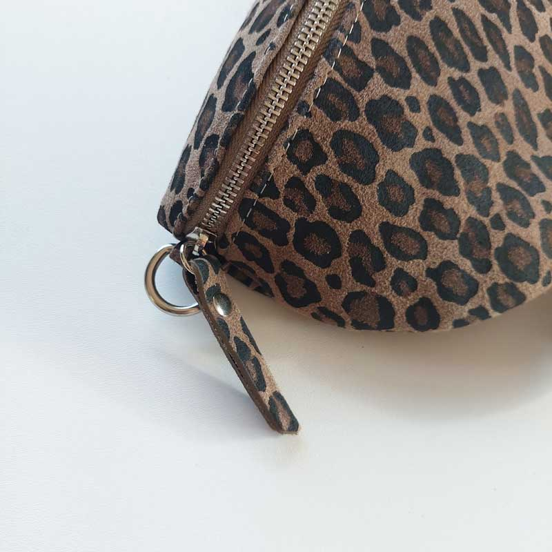 Entdecken Sie unsere trendige braune Bauchtasche aus Wildleder mit kleinem, schwarz-braunem Leopardenmuster. Unsere Bauchtasche verkörpert den lässigen Look und das erstklassige Handwerk, für das italienische Ledermanufakturen weltberühmt sind. Jede Tasche wird mit größter Sorgfalt und Liebe zum Detail in Italien hergestellt, um höchsten Qualitätsansprüchen gerecht zu werden.
