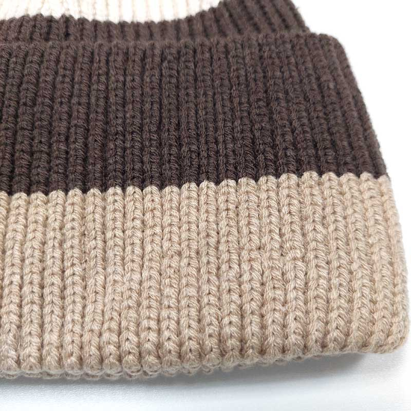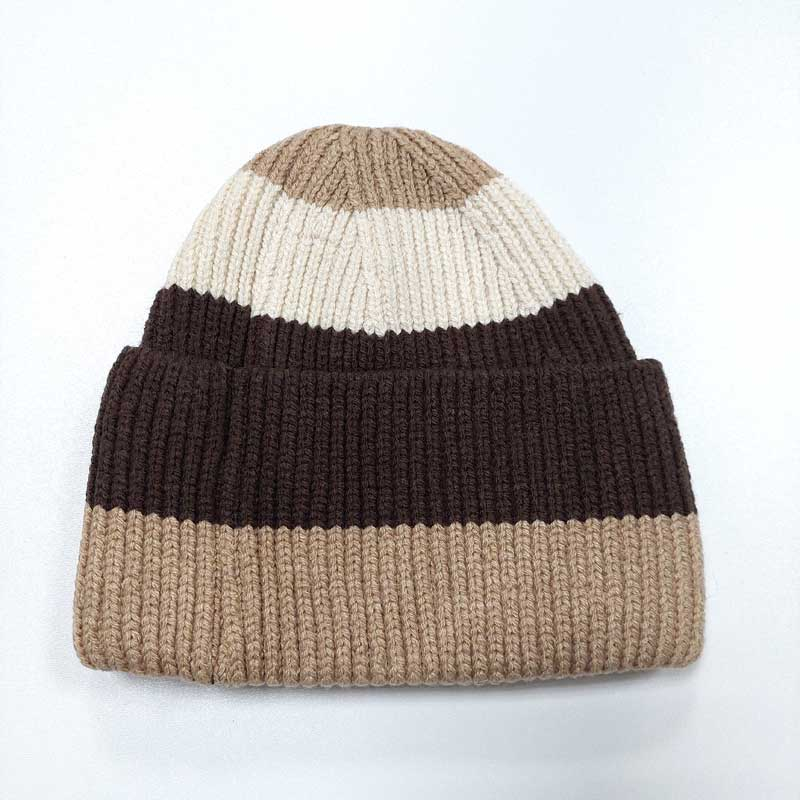 Eine klassische Mütze im Rippenstrick mit Streifen in trendigen Brauntönen