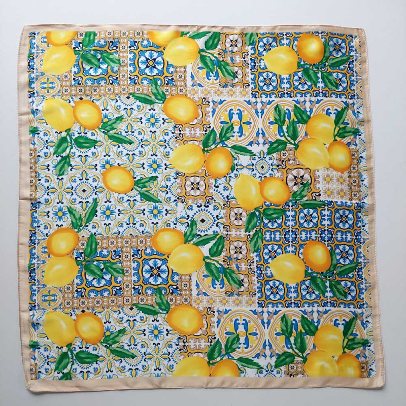 Setzen Sie ein stilvolles Statement mit diesem klassischen Tuch im Format 70x70 cm, das durch sein grafisches Kachel-Muster in Blau, Weiß und Gelb und den knackigen Zitronen sofort ins Auge fällt. Der kontrastreiche Print verleiht dem stilvollen Accessoire eine zeitgemäße, urbane Note.