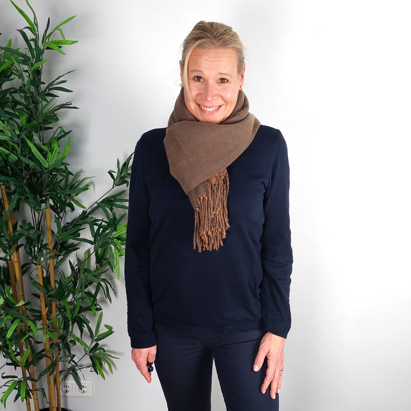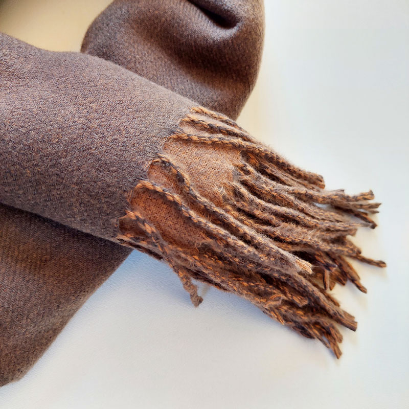 Die Zweifarbigkeit in klassischem mattem Braun und edlem Nougat macht den Schal zu einem vielseitigen Begleiter für jede Gelegenheit. Ob Sie ihn zu einem eleganten Kleid oder einer lässigen Jeans tragen, der Schal verleiht Ihrem Look sofort eine Extraportion Klasse.