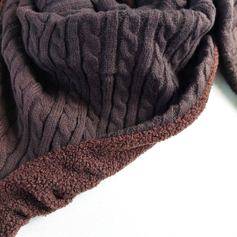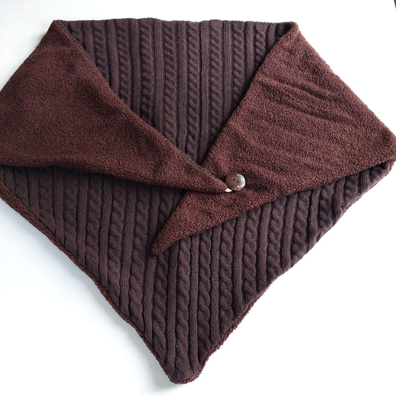 Ein Wendeschal in trendigem Dunkelbraun. Das Doubleface Dreieckstuch besteht auf der einen Seite aus Zopfstrickstoff und auf der anderen Seite aus Bouclestoff. Ein runder Knopf hält alles zusammen.