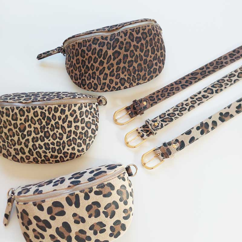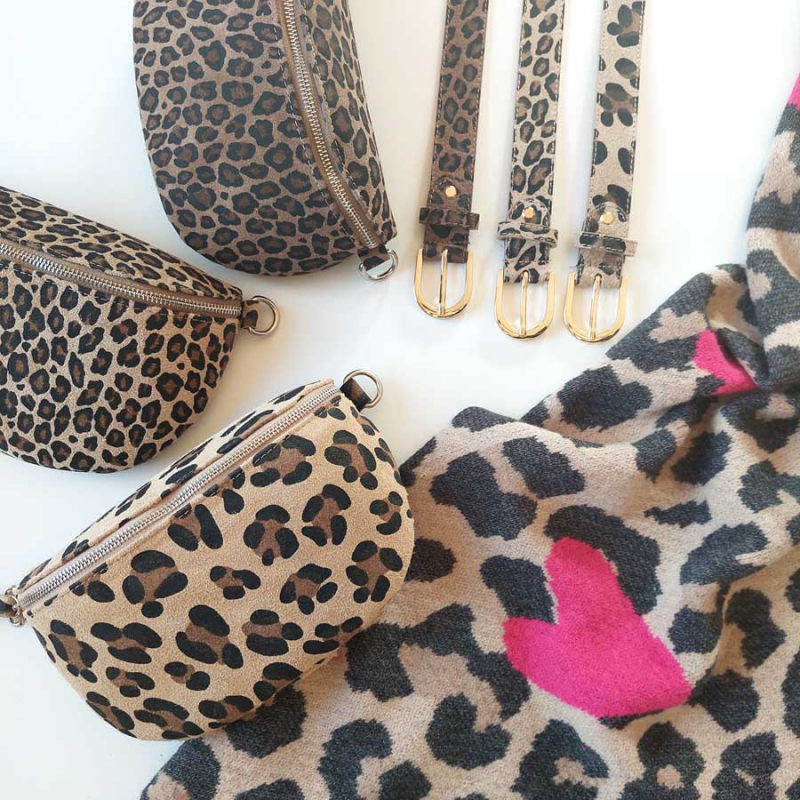 Bauchtasche Wildleder kleines Leomuster Animal Print - schwarz braun beige -silber Schnallen-Made in Italy
