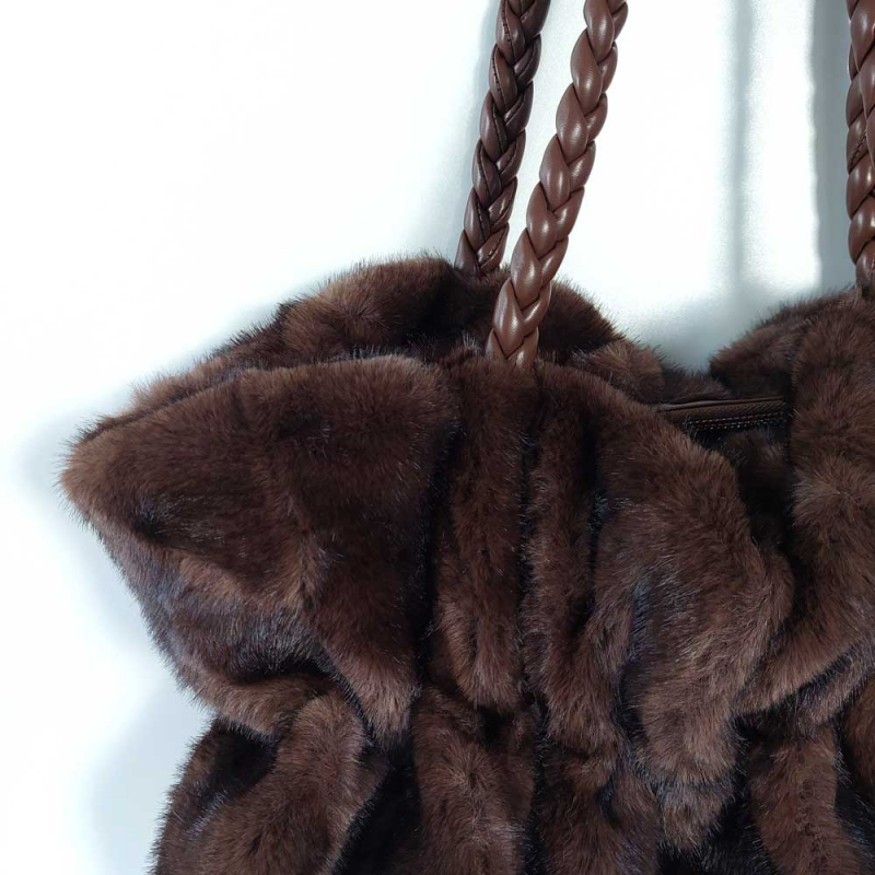 Eine elegante Tasche aus dunkelbraunem Fellimitat und geflochtenen Henkeln. Das Fellimitat ist hochwertig und flauschig weich.Verschlossen wird die Tasche mit einem goldenen Metallreißverschluss. Die leicht geraffte Form wird durch ein eingezogenens Gummiband erzeugt, das sich bei Befüllen der Tasche entsprechend ausdehnt. Somit ist die Tasche sehr geräumig und bietet viel Stauraum.