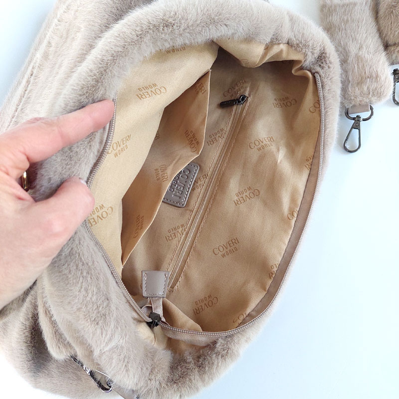 Diese Tasche vereint luxuriöse Optik mit praktischer Funktionalität. Das edle taupe Fellimitat sorgt für einen weichen, modernen Look, der jedes Outfit aufwertet. Das Fellimitat ist dicht,und extrem weich und flauschig. Aufgrund des breiten Riemens kann die Tasche über die Schulter oder am Handgelenk getragen werden. Für noch mehr Flexibilität gibt es zusätzlich einen schmalen Schultergurt, sodass Sie die Tasche je nach Anlass variabel tragen können.