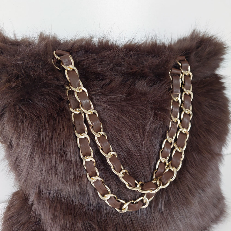 Eine elegante Tasche aus dunkelbraunem Fellimitat mit Henkeln und Schulterriemen. Die Taschenhenkel aus goldener Ketter verziert mit einem braunen Lederimitatband geben der Tasche einen exquisiten Charakter. Das Fellimitat ist flauschig weich und sieht hochwertig aus. Verschlossen wird die Tasche mit einem Reißverschluss. Der Schulterriemen ist verstellbar. Innen hat die Tasche eine kleine Reißverschlusstasche.