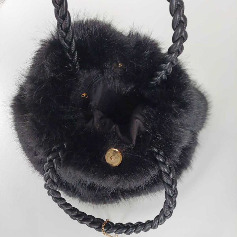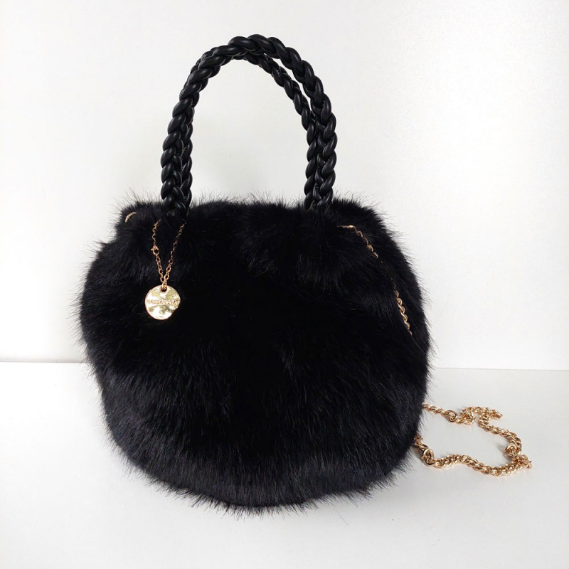 Eine elegante, runde Tasche aus schwarzem Fellimitat, geflochtenen Henkeln aus Kunstleder und einer goldenen Kette als Schulterriemen sowie einem goldenen Anhänger. Das Fellimitat ist flauschig weich und sieht hochwertig aus. Verschlossen wird die Tasche mit einem goldenen Magnetverschluß, innen hat die Tasche eine Reißverschlusstasche und der Boden ist aus schwarzem Kunstleder.