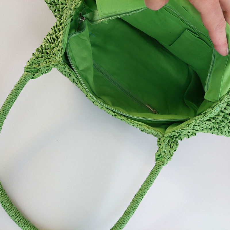 Ein praktischer Reißverschluss an der Oberseite schützt den Inhalt zuverlässig. Im Inneren überrascht die Tasche mit einem farblich abgestimmten grünen Futter sowie einer zwei zusätzlichen Stecktaschen und einer kleinen Reißverschlusstasche, in der Smartphone oder Schlüssel griffbereit verstaut werden können. Ob beim Stadtbummel, im Urlaub oder im Alltag – diese Tasche verbindet Natürlichkeit mit Funktionalität und Stil.