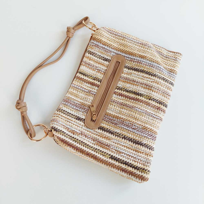 Ein lässige, kleine flache Handtasche mit Streifen in Naturtönen. Oben wird die Tasche mit einem Reißverschluss geschlossen. Die goldene Ringe an den Seiten geben der Tasche eine coolen Look, genau wie der geknotete Taschenhenkel aus Lederimitat. Außen hat die Tasche auf der Rückseite eine Reißverschlusstasche.